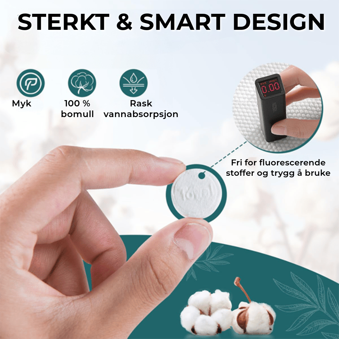 Liten som en mynt, men utvider seg til 22 x 22 cm i vann – perfekt for vesken eller lommen. Bare tilsett vann – varmt eller kaldt – og nyt umiddelbar friskhet uten problemer. Ingen stress, bare komfort – du fortjener denne lettheten i hverdagen!