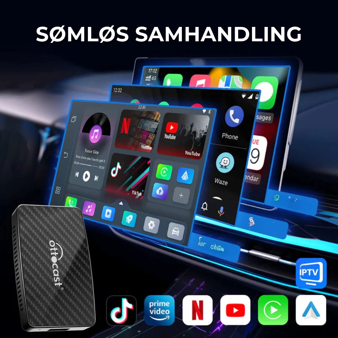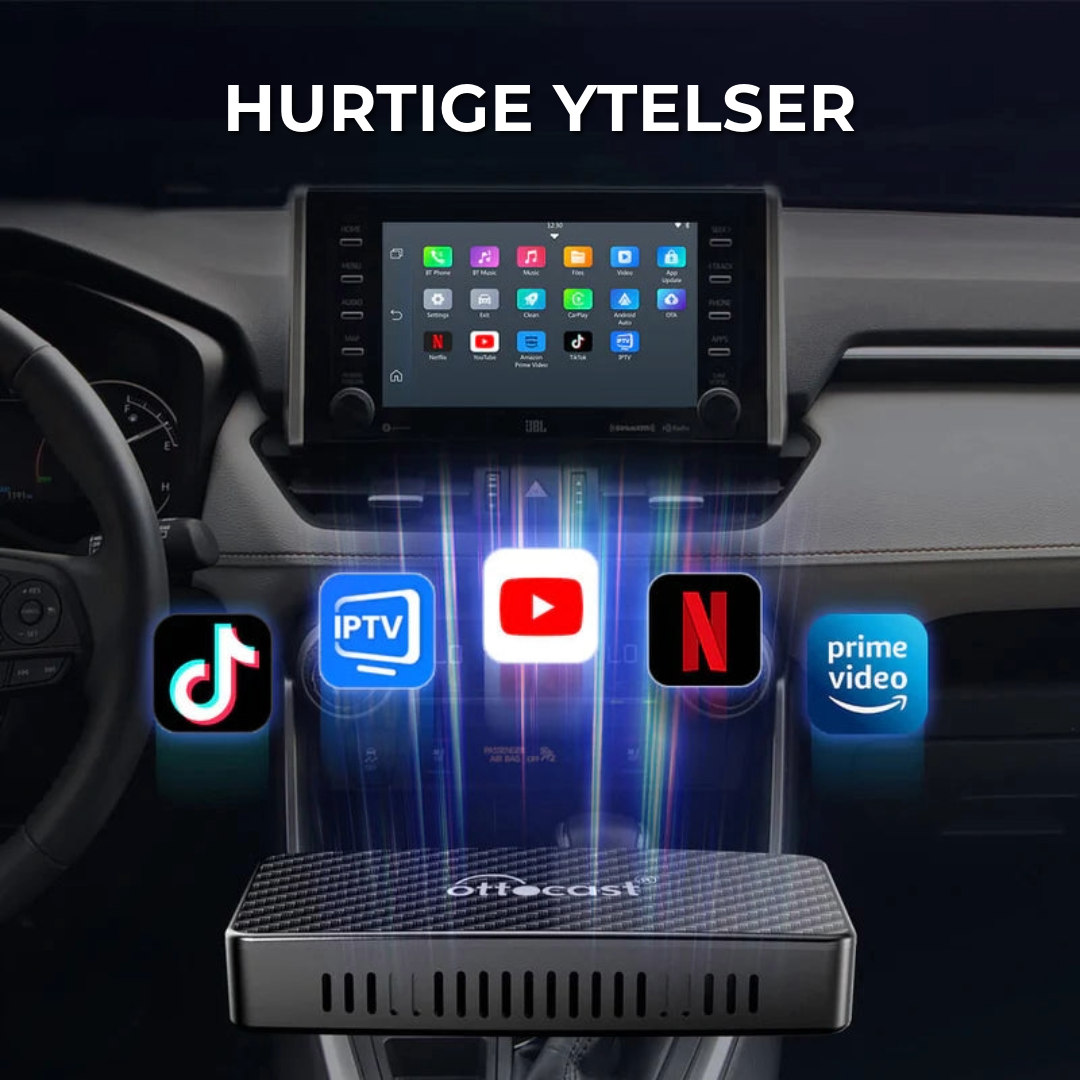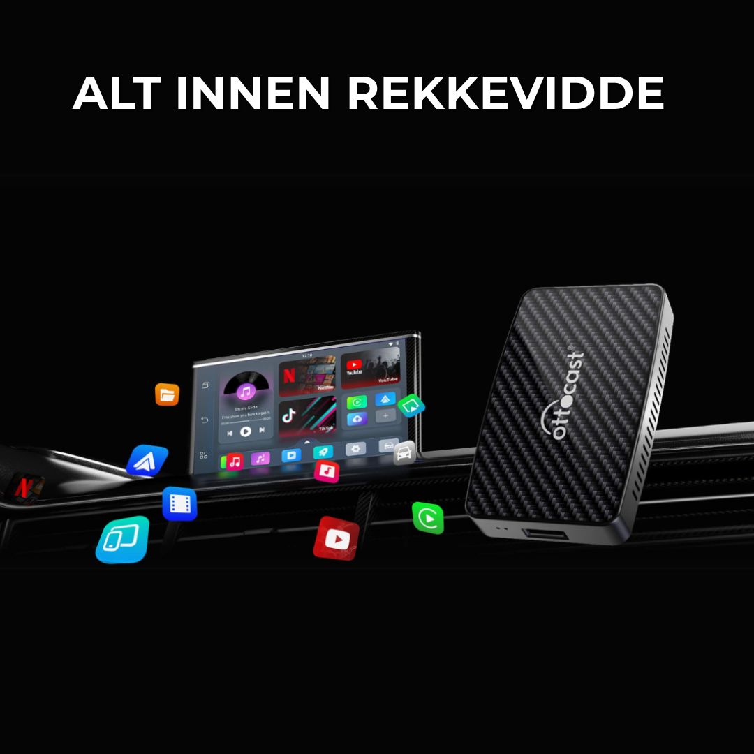 OTTOCAST™ gir direkte tilgang til YouTube, Netflix, TikTok, og mer, og bytter sømløst mellom trådløs Apple CarPlay og Android Auto. Perfekt for underholdning, navigasjon og handsfree bekvemmelighet. Ideell for lange turer eller køer!