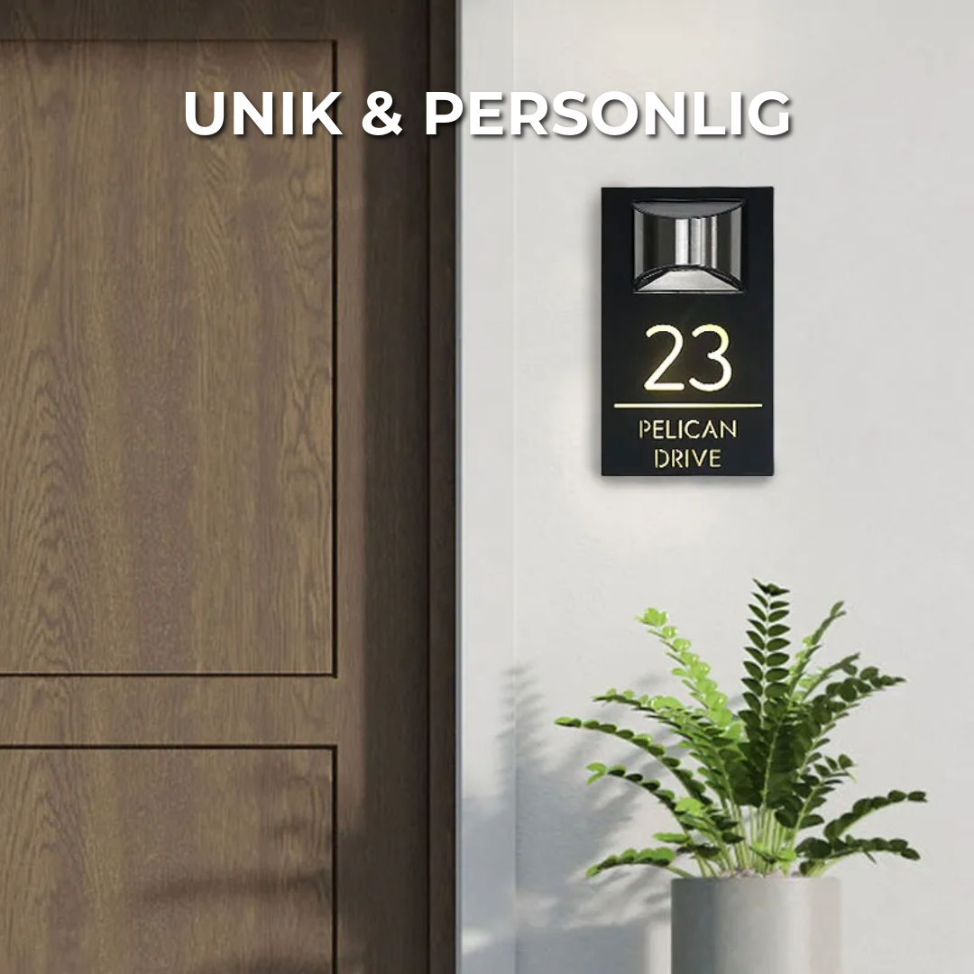 Gi hjemmet ditt et luksuriøst utseende med vårt personlige husnummer. Takket være automatisk solbelysning blir husnummeret ditt stilfullt belyst i skumringen, mens den svevende akryldesignet gir et moderne preg.