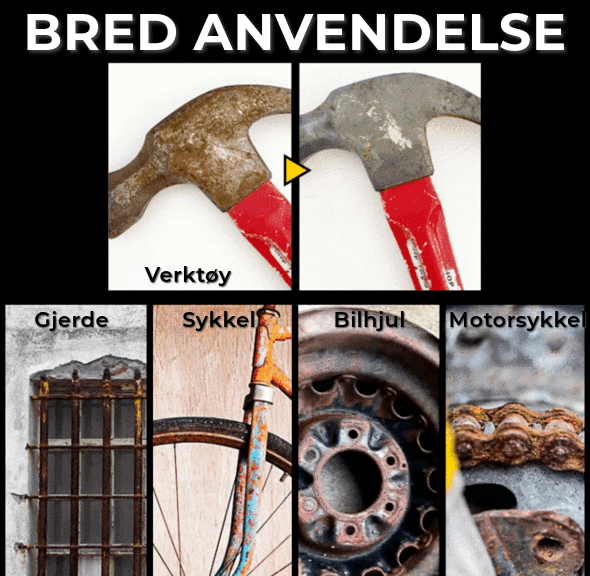 Enten det er metall, krom eller malte overflater, fungerer vår Rustfjerningsspray på alle typer materialer. Perfekt for biler, verktøy, kjøkkenapparater, hagemøbler og mer.