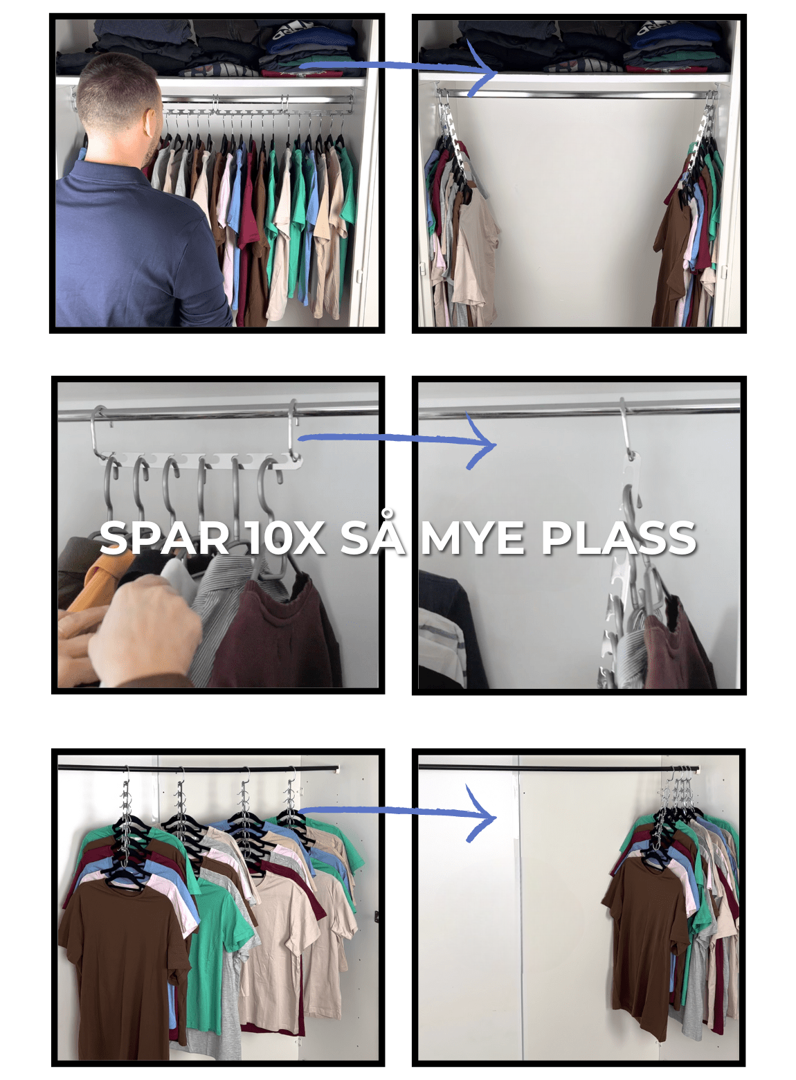 Dette innovative opphengssystemet gjør det mulig å henge opptil 12 klesplagg på plassen til bare én kleshenger. Få umiddelbart mer plass til flere klær eller bedre organisering.