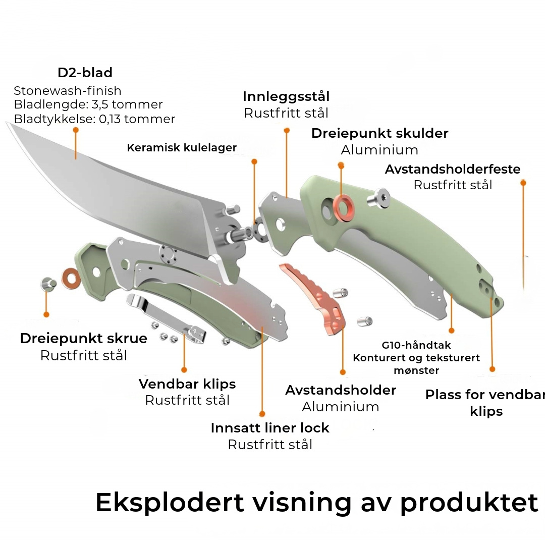 Skal du på camping, fiske, jakt – eller bare vil være forberedt? Denne kniven er din pålitelige følgesvenn. Med et skarpt D2-blad, myk og rask åpning, og et G10-håndtak med godt grep, får du kontroll og styrke i ett.
