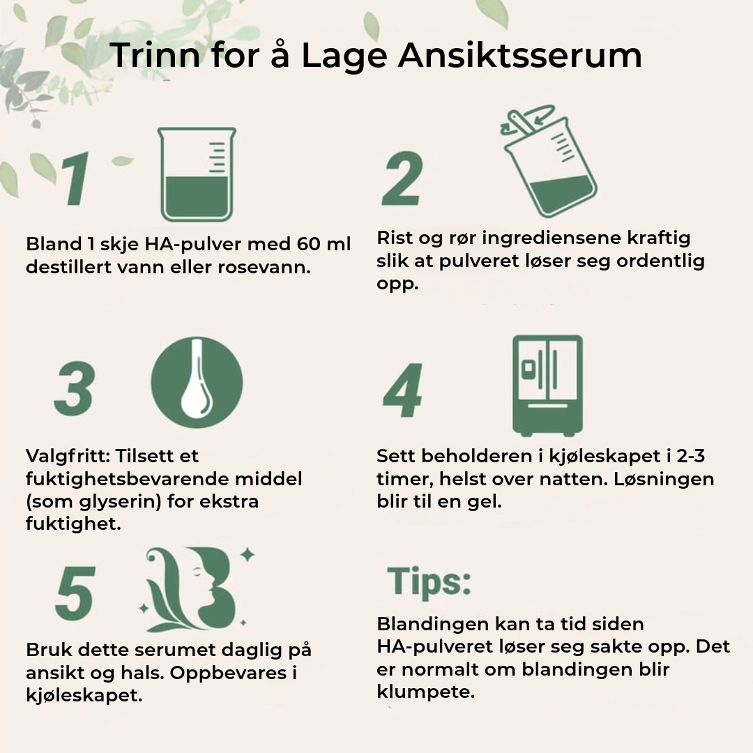 Vil du ha en ungdommelig, strålende hud med intens fuktighet? Dette 100% rene, laboratorieklasse hyaluronsyrepulveret er nøkkelen til en dypt hydrert og smidig hud – uten unødvendige tilsetninger!